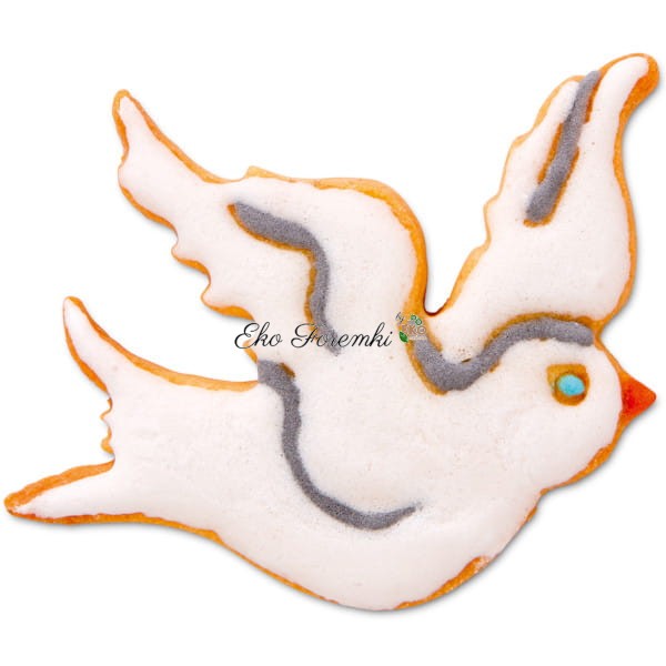 Nisko latające jaskółki są zwiastunem deszczu upieczonych ciasteczek, a co symbolizuje nasz gołąb podrywający się do lotu? Na pewno szczęście i pokój, ale również radość i błogość w ustach łasuchów, zajadających się pysznymi gołąbkami. Wycięty z masy cukrowej może być ozdobą weselnych oraz komunijnych wypieków.