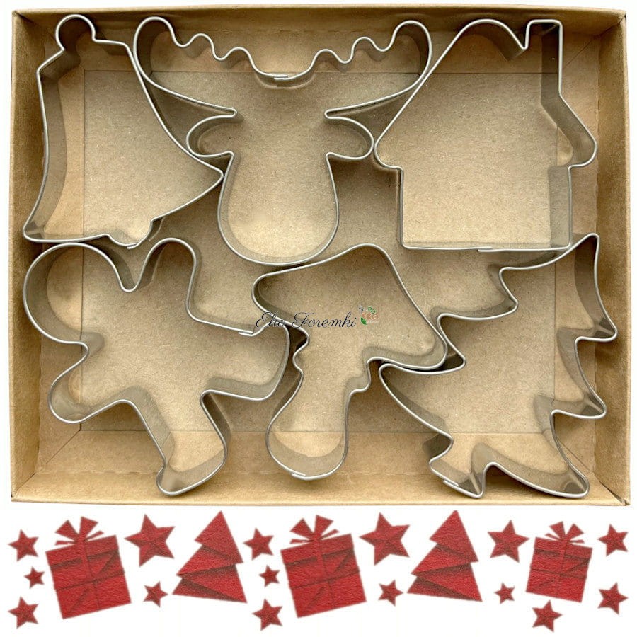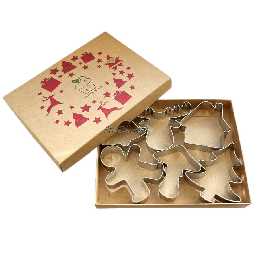 Zestaw zawiera foremki w kształcie choinki, renifera, domku, piernikowego ludzika, muchomorka i dzwoneczka, umieszczone w pięknym pudełku z motywem świątecznym.