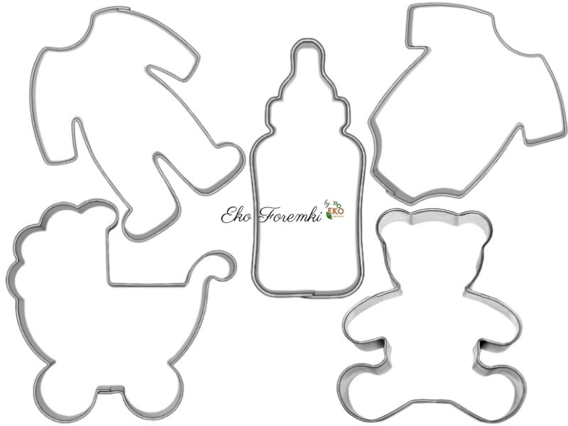 Zestaw foremek niemowlęcych – śpioszki, butelka, wózek i miś