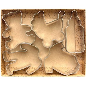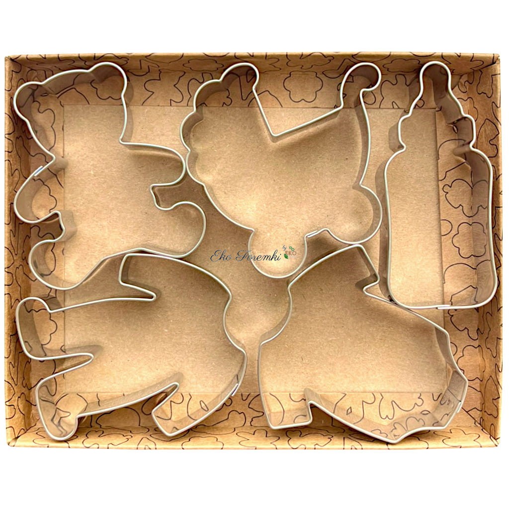 Foremki do ciastek w kształcie śpioszków, wózka, butelki i misia idealnie sprawdzą się na przyjęcia dla najmłodszych. Zestaw zapakowany w eleganckie opakowanie kraft świetnie nadaje się na prezent.