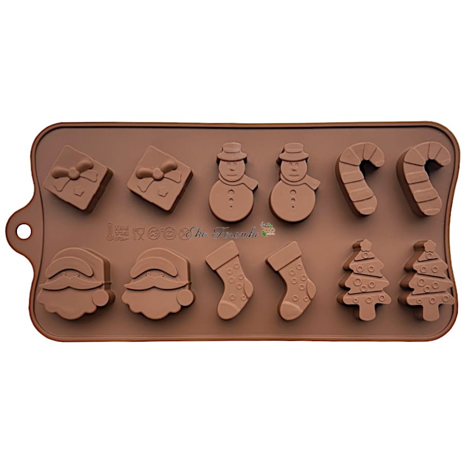 Forma na świąteczne praliny posiada różne bożonarodzeniowe kształty takie jak laska cukrowa, Mikołaj, bałwanek, prezent, choinka czy świąteczna skarpeta, a dodatkowo pozwala na łatwe odlewanie i wyjmowanie czekoladowych słodkości.