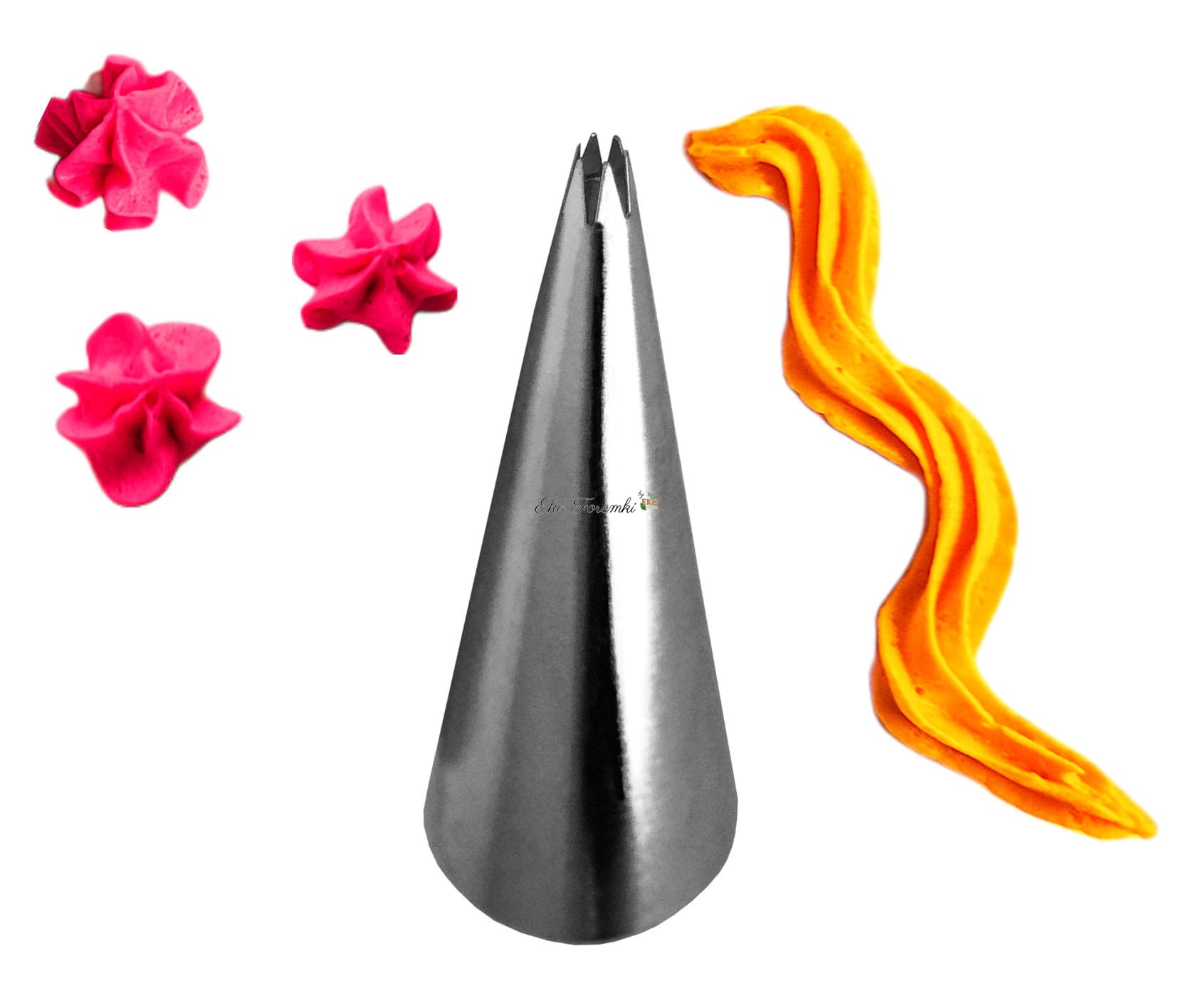 Przeznaczenie - końcówka dekoracyjna do szlaczków, pasków, łańcuszków, kropek oraz kwiatuszków, wężyków, muszelek, spirali i szczegółowych zdobień. Sprawdza się przy dekorowaniu ciast i tortów oraz przy ozdabianiu pierników. Końcówka cukiernicza do dekorowania kremem, bitą śmietaną, lukrem maślanym i innymi masami cukierniczymi.