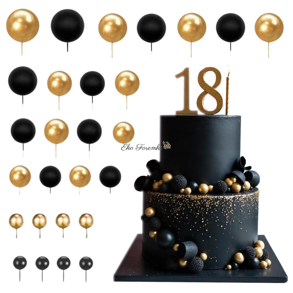 Zestaw 27 dekoracyjnych kulek na piku to kompaktowa wersja eleganckiej ozdoby do tortów i deserów. Zawiera kuleczki w kolorze czarnym i złotym, o różnych średnicach, które w połączeniu tworzą efektowną, dynamiczną kompozycję. Kuleczki wykonane są z lekkiej pianki PE, osadzone na elastycznych drucikach florystycznych, co pozwala łatwo je wbijać w wypieki i dowolnie układać.