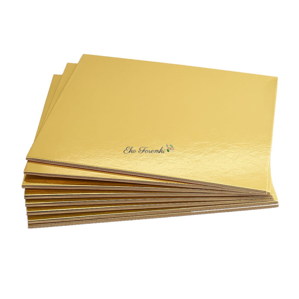 Każda podkładka została wykonana z wytrzymałej tektury o gramaturze 700 g/m² i pokryta błyszczącą, tłuszczoodporną folią, która zabezpiecza przed przemoczeniem i zabrudzeniami. Grubość 1 mm zapewnia stabilność deserów, a złote wykończenie dodaje całości klasy i profesjonalnego wyglądu. To idealne rozwiązanie do prezentacji monoporcji w witrynach cukierniczych oraz na stołach bankietowych. Wysoka jakość wykonania sprawia, że każda słodka kompozycja wygląda jak z najlepszej cukierni.