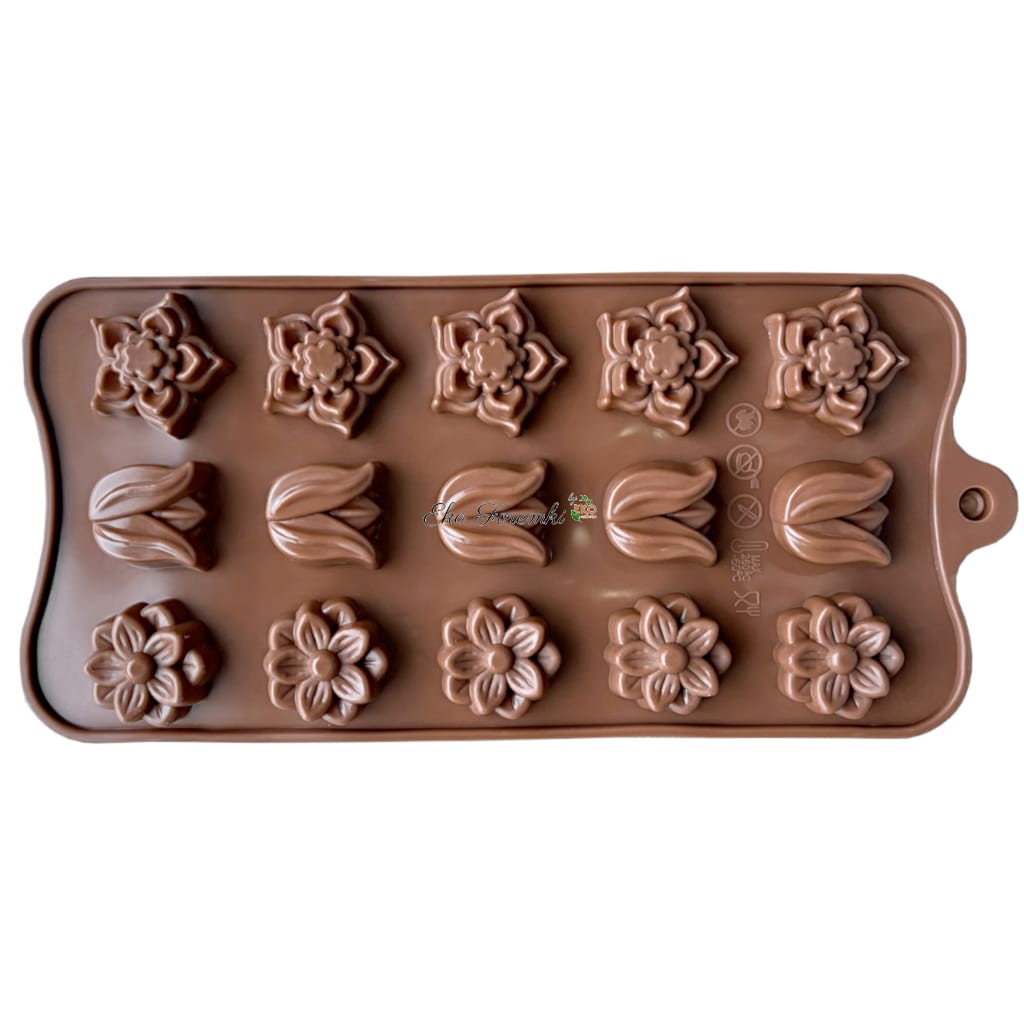 Silikonowa forma na czekoladki i praliny w kształcie tulipanów oraz kwiatów pozwoli Ci przygotować eleganckie słodkości o wyjątkowym wyglądzie. Zawiera 15 zagłębień w trzech różnych wzorach kwiatowych – idealna do domowych pralin, żelek i deserów.
