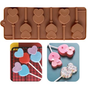 Forma do lizaków w kształcie serc to wyjątkowy gadżet, który pozwala na przygotowanie słodkich upominków z czekolady, karmelu lub masy cukierniczej. Posiada 6 starannie zaprojektowanych wgłębień w postaci podwójnych serduszek oraz specjalne miejsce do wygodnego umieszczenia patyczków, dzięki czemu gotowe lizaki prezentują się efektownie i są łatwe do trzymania. Foremka wykonana została z elastycznego silikonu, który ułatwia wyciąganie gotowych słodyczy bez ryzyka uszkodzeń, a także zapewnia trwałość i komfort użytkowania.