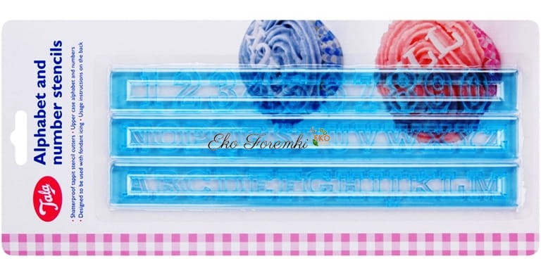 Zestaw 3 szablonów do wycinania dekoracji z mas cukrowych brytyjskiej marki Tala. Dzięki niemu wykonasz bardzo precyzyjne napisy oraz wytniesz idealnie równe cyfry. Zestaw składa się z 3 elementów na których umieszczono drukowane litery od A do Z oraz cyfry od 0 do 9.
