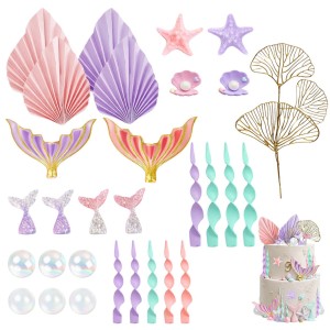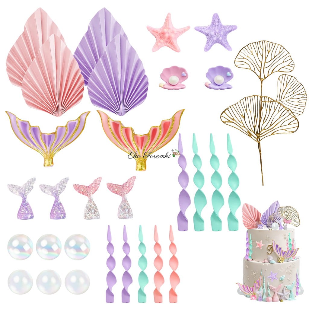 W skład zestawu wchodzą ogony syrenek w kilku wariantach kolorystycznych, spiralne dekoracje, papierowe muszle wachlarzowe, złote liście dekoracyjne, rozgwiazdy, muszelki z perłowym efektem oraz opalizujące kule. Elementy można dowolnie rozmieszczać na torcie, dopasowując kompozycję do jego wielkości oraz własnej wizji. Lekka konstrukcja dekoracji sprawia, że są łatwe w użyciu, a całość pozwala uzyskać spektakularny efekt bez skomplikowanych technik cukierniczych.